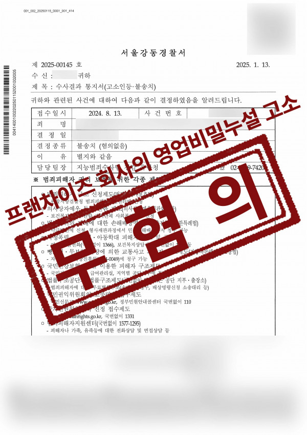 형사(무혐의) 프랜차이즈본사 가맹점분쟁, 부정경쟁방지법위반(영업비밀누설) 무혐의 성공사례