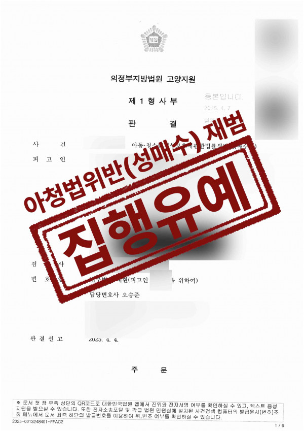 성범죄(집행유예) 15세 미만 아청성매수 조건만남 성관계 적발 성매매전력 의뢰인 집행유예 성공사례
