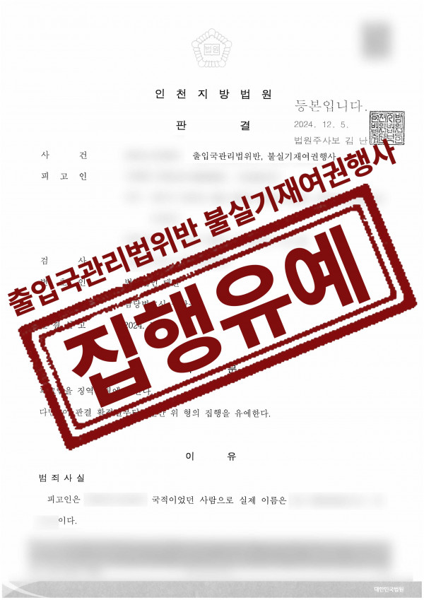 형사(집행유예) 출입국관리법위반,불실기재여권행사 등으로 연루된 의뢰인 집행유예 성공사례