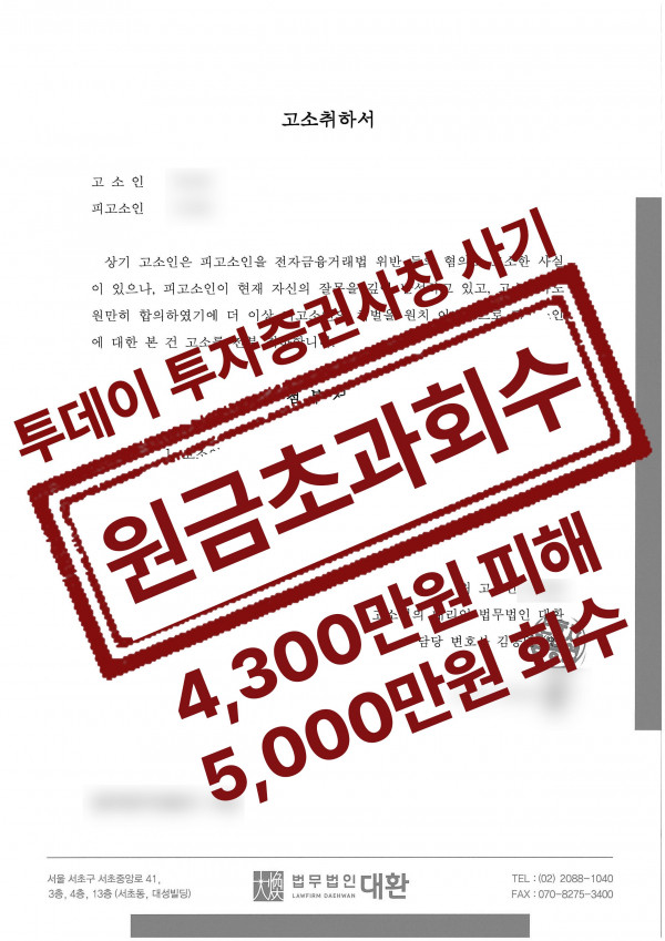 저희는 1.5개월 만에 투데이 투자증권 사칭사기 사건에서 합의금 5,000만원을 받아 기존 피해액보다 크게 회수하였습니다.