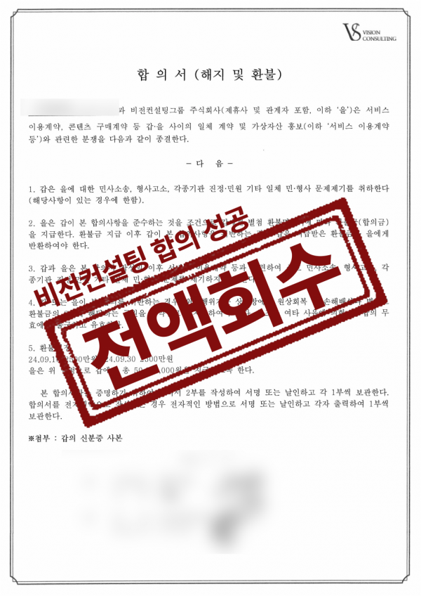 비전컨설팅사기 피해 전액 합의를 통한 5,000만원 회수 성공사례