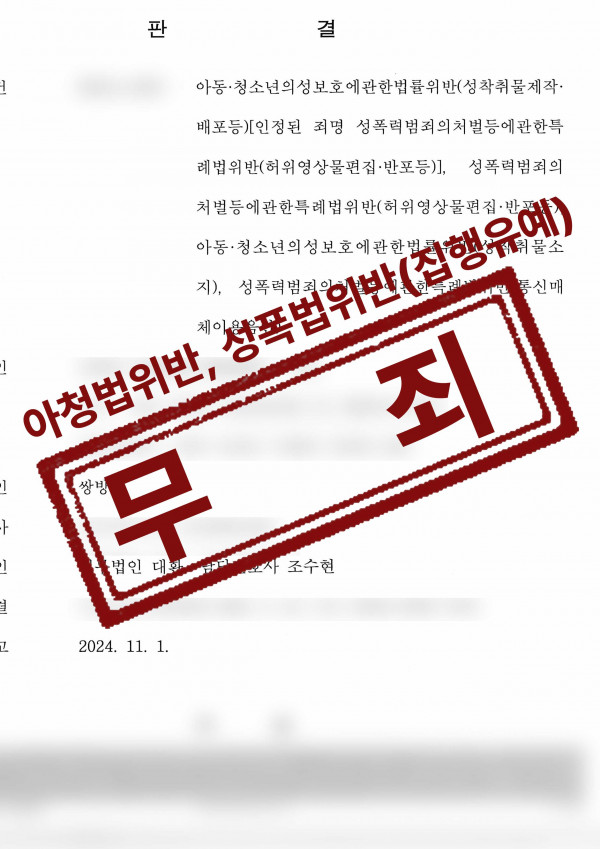아동청소년의 얼굴 사진과 연령불상의 여성의 몸을 합성한 사안에 대하여, '아동청소년이 직접 등장'하거나 '아동청소년으로 명백히 인식되는 사람이나 표현물이 등장'하는 성착취물이 아니라는 성범죄변호사의 주장을 받아들여, 아청법을 적용한 원심을 파기하고 아청법은 무죄, 성폭법은 집행유예를 선고하였습니다.
