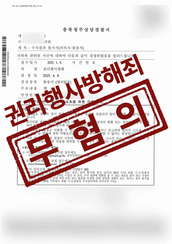 그 결과, 의뢰인은 기소되지 않고 권리행사방해 무혐의 처분을 받을 수 있었습니다.
