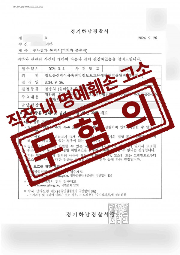 수사기관은 이러한 변호인의 주장을 받아들여, 결국 명예훼손 혐의는 인정되지 않는다고 판단하여 무혐의 처분을 내렸습니다.