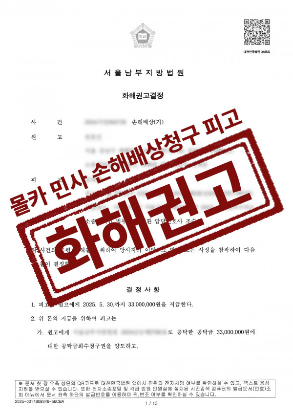 이러한 주장을 바탕으로 재판부는 강제적인 판결이 아닌, 양 당사자가 수용 가능한 수준의 화해권고결정을 내렸고, 의뢰인은 이 결정을 수용함으로써 민사상 부담을 최소화할 수 있었습니다.