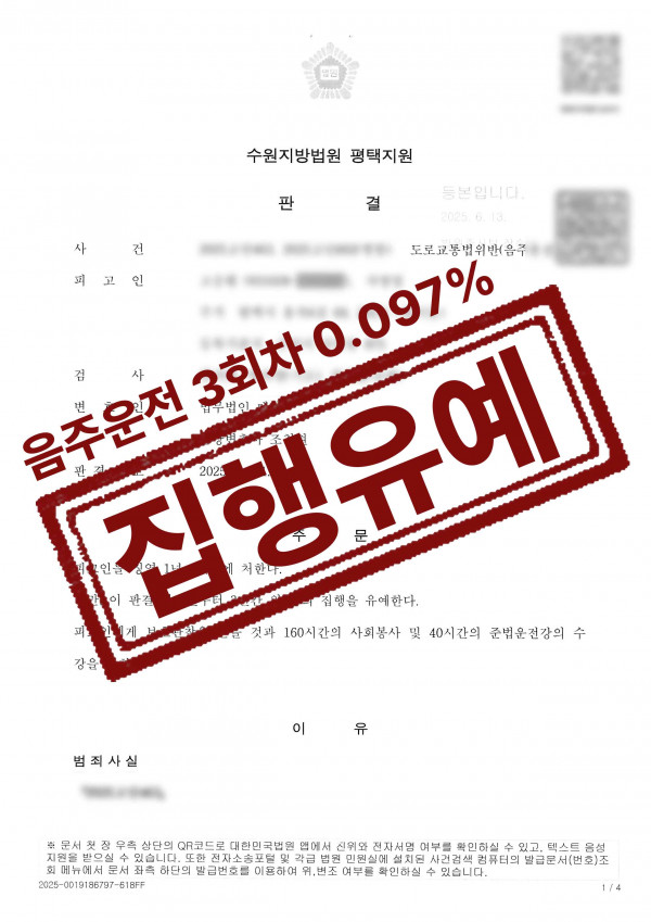 음주운전 3회차 0.097% 높은 알코올농도 집행유예 성공사례