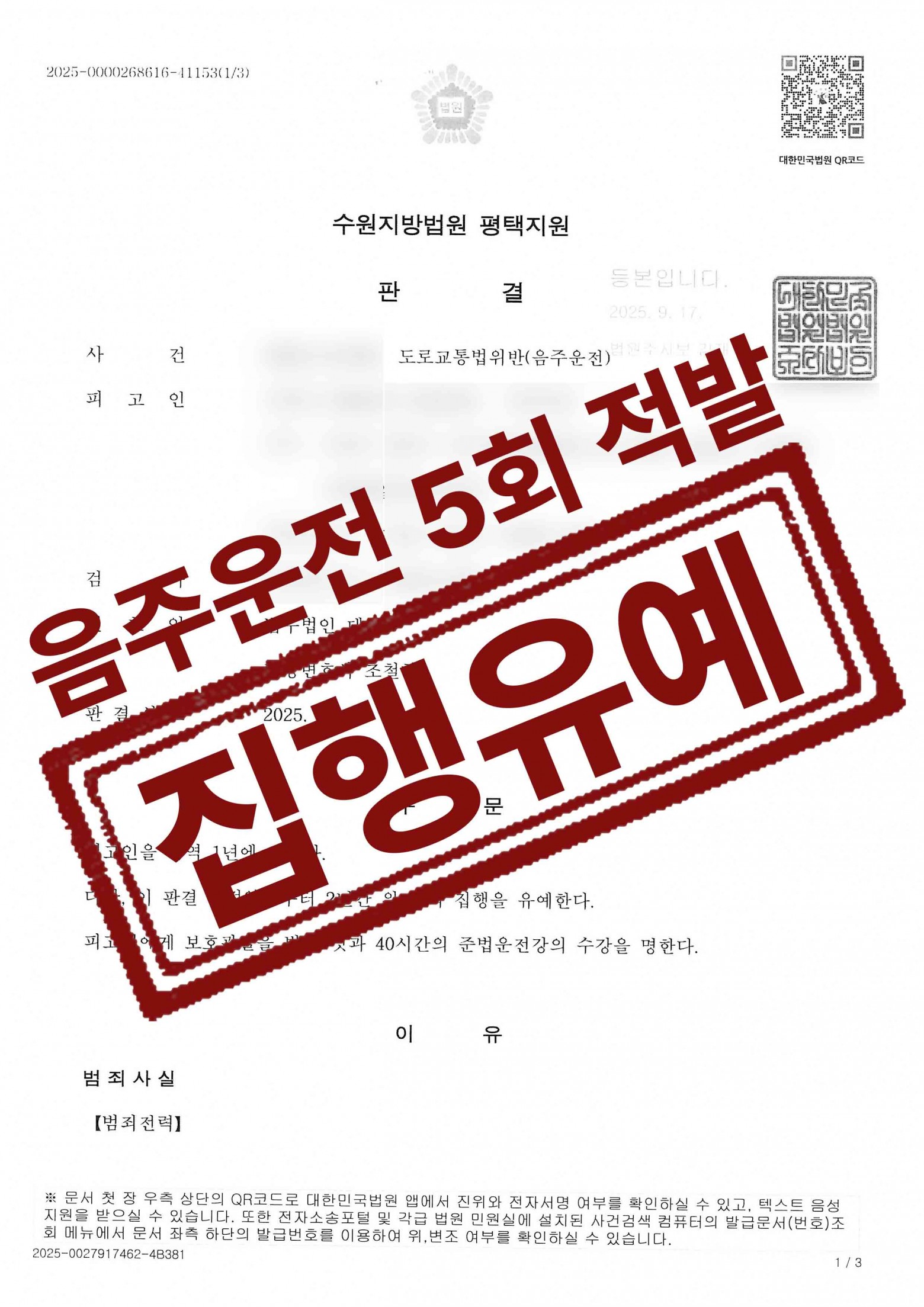 형사(집행유예) 음주운전 5회차 0.100% 집행유예 성공사례