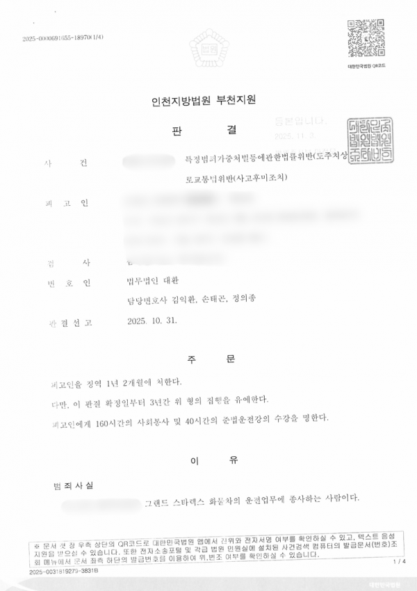 → 사건명 특정범죄가중처벌등에관한법률위반(도주치상) 및 도로교통법위반(사고후미조치) 형사 사건 → 의뢰인 상황 의뢰인은 865122호 그랜드 스타렉스 화물차 운전 업무에 종사하는 피고인이었습니다. 평소 안전 운전을 위해 주의 의무를 다했으나, 2025년 2월 20일 부천시 원미구 원미로 182 부일초교삼거리 인근에서 좌회전 중 예상치 못한 사고가 발생했습니다. 사고로 피해자는 경추 염좌 등의 부상을 입었고, 오토바이가 손괴되었습니다. 의뢰인은 순간적인 판단 미스로 현장을 이탈했으나, 사고 후 적극적으로 피해자와 합의하고 자신의 과실을 인정했습니다. → 쟁점 → 업무상 주의의무 위반 여부: 피고인이 중앙선을 침범하여 사고를 일으킨 과실 정도 → 사고 후 미조치(도주) 혐의: 사고 직후 현장을 이탈한 행위의 법적 책임 범위 → 양형 고려 요인: 피고인의 이전 벌금형 전력, 피해자의 상해 정도, 범행 인정 및 합의 여부 → 형 집행유예 및 사회봉사·강의 수강 가능성: 범행 후 태도와 사회적 책임 이행 여부 |