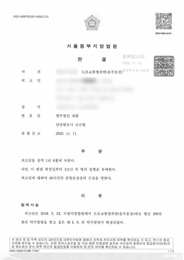 ④ 법무법인 대환의 전략 → 범죄사실 정리: 과거 전과, 범행 상황, 단속 기록, 혈중알코올농도 등 관련 증거 정리 → 양형 사유 분석: 동종 범죄 전력, 사고 여부, 범행 후 정황, 연령·성행 등을 종합하여 정상참작 근거 마련 → 집행유예 가능성 확보: 재범 방지를 위한 교육·준법의지 강조, 법정 진술 및 변호 의견서 제출 → 형량 최소화 전략: 실제 위험 발생이 미미하고 사고가 없다는 점을 입증하여, 징역형 선고 시 집행유예 및 교육명령을 이끌어냄 ⑤ 결과 → 피고인에게 징역 1년 6월, 집행유예 3년 선고 → 준법운전강의 40시간 수강 명령 부과 → 실제 형 집행은 유예되어 의뢰인은 자유를 유지하며 재범 방지를 위한 교육을 받게 됨 ⑥ 의미 본 사건은 동종 범죄 전력자가 다시 음주운전을 한 경우에도, 사고나 피해가 없고 재범 방지를 위한 의지를 보일 경우 형 집행을 유예할 수 있다는 점을 보여주는 사례입니다. 법무법인 대환은 피고인의 과거 전과, 범행 당시 상황, 양형조건 등을 체계적으로 정리하고, 정상참작 사유를 적극적으로 입증함으로써 형 집행을 유예하고 재사회화 가능성을 확보하는 데 성공하였습니다. 향후 유사 사건에서도 동종 범죄자라도 사고나 피해가 없고 재범 방지 의지를 입증하면 형량을 조정할 수 있다는 전략적 대응이 중요한 의미를 갖습니다. |