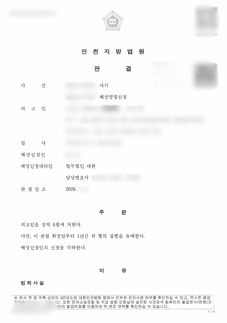 아울러 형사 절차와 병행하여 배상신청 절차를 진행하며실질적인 피해 회복이 이루어질 수 있도록 합의 과정 역시 적극적으로 지원하였습니다.
