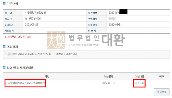 형사(기소유예) 감염병의예방및관리에관한법률 위반 혐의 입건 사건 – 기소유예 성공사례